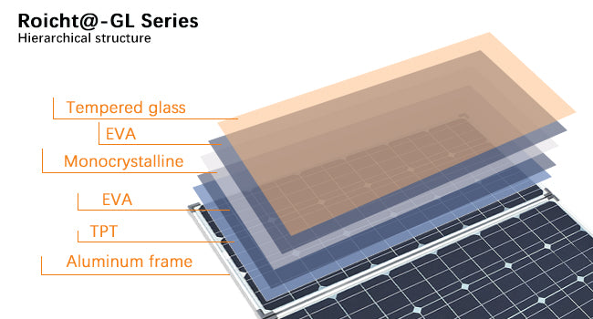 Roicht@-GL Series solar charger is made of high-efficiency monocrystalline cells, the cell conversion rate is as high as 23%. High quality tempered glass and bypass diodes reduce power drop caused by shadows and ensure excellent performance in low-light environments.